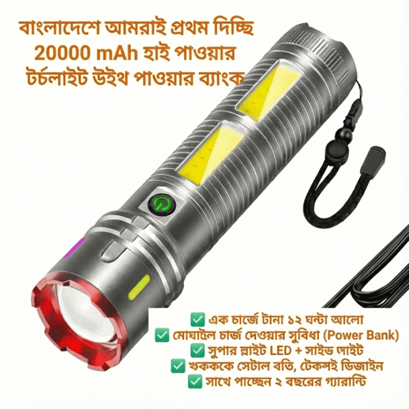 🔥 মজবুত মেটাল বডি: এটি সস্তা প্লাস্টিকের লাইট নয়। প্রিমিয়াম মেটাল বডি হওয়ায় হাত থেকে পড়লেও সহজে ভাঙবে না। সাথে আছে ওয়াটারপ্রুফ ডিজাইন, তাই বৃষ্টিতেও নষ্ট হবে না।